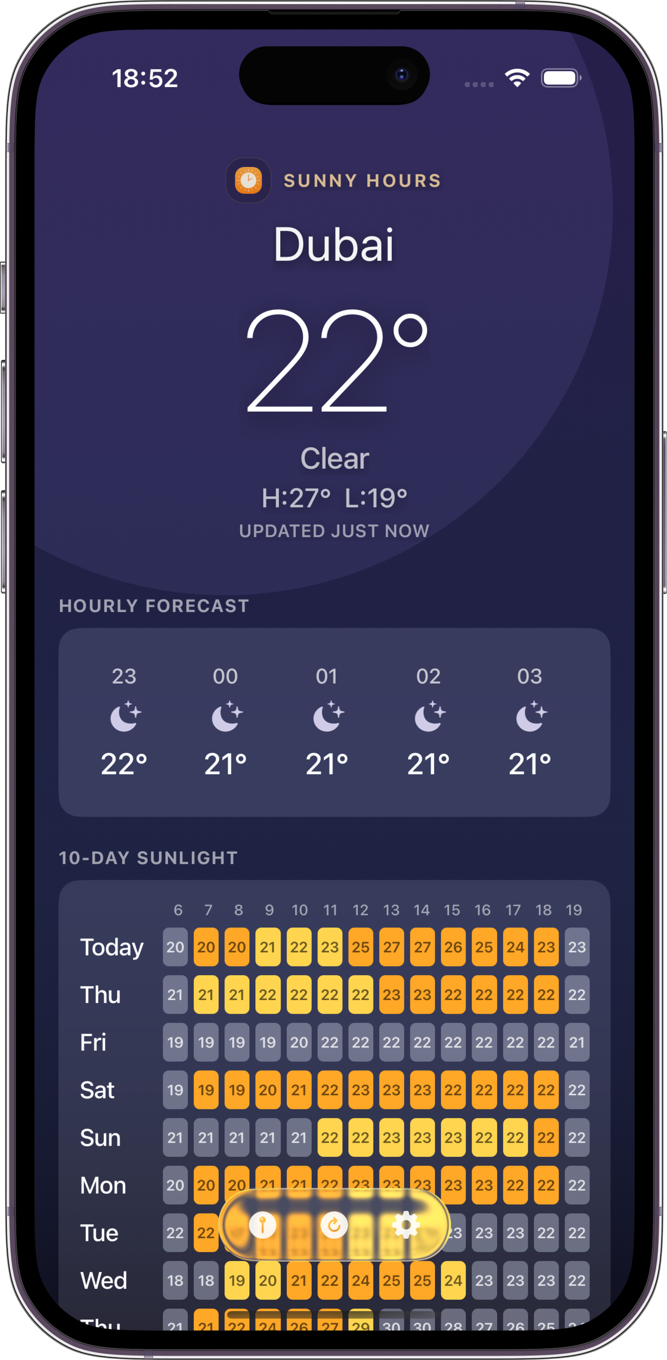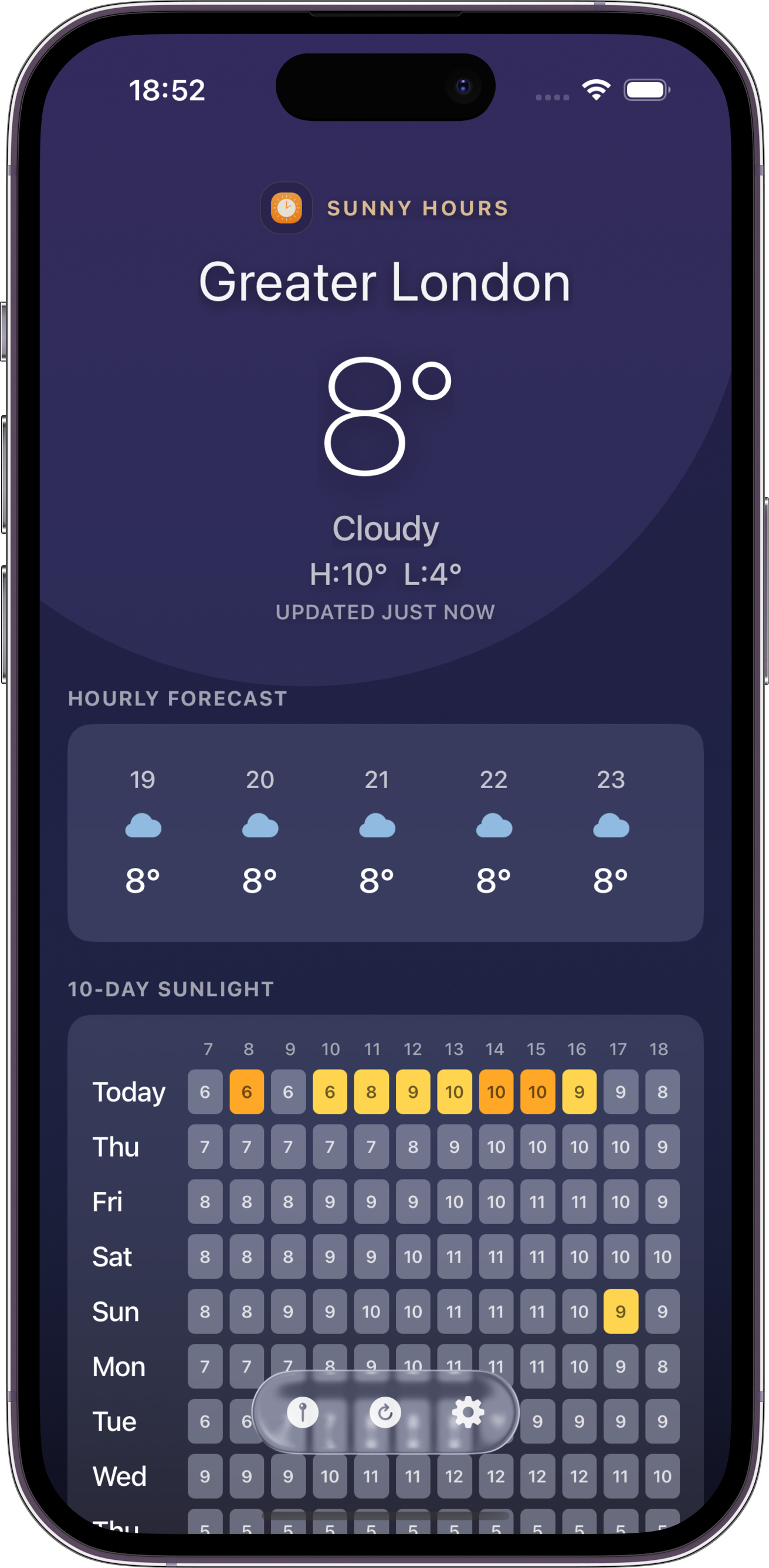 A colour-coded 10-day grid that reveals the brightest hours at a glance. No more guessing.